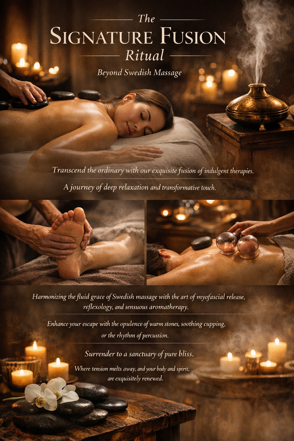 While Swedish massage is known for its relaxing, circulation-enhancing strokes, our Signature Fusion elevates the experience into a fully immersive, multi-modal luxury ritual.